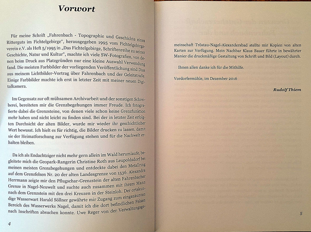 Heimatforscher Rudolf Thiem geht in seiner Schrift, die 1995 erstmals erschienen ist, der Geschichte und der Topographie des früheren Ritterguts Fahrenbach bei Tröstau im Fichtelgebirge nach. Er hat das Buch im Jahr 2017 herausgegeben, mit zusätzlichen Fotografien, die in der ersten Veröffentlichung keinen Platz gefunden hatten. Es enthält Bilder, die der Autor selbst bei den Grenzbegehungen vor Ort gemacht hat. Seine Spurensuche führte ihn fast 1.000 Jahre zurück, bis in die Jahre des Kaisers Heinrich IV.